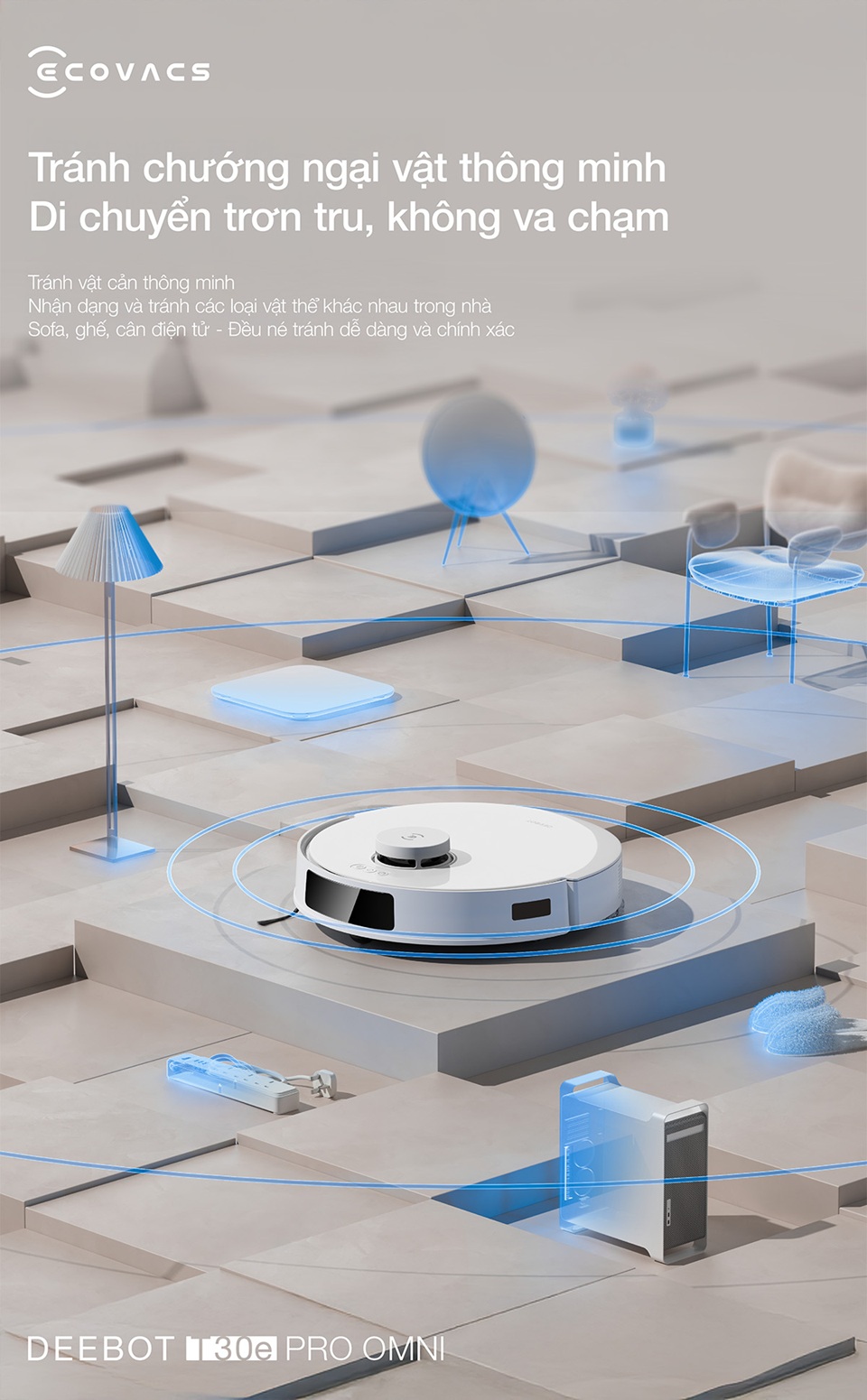 Tránh vật cản thông minh: nhận diện ghế, sofa, cân điện tử, đồ chơi nhỏ.