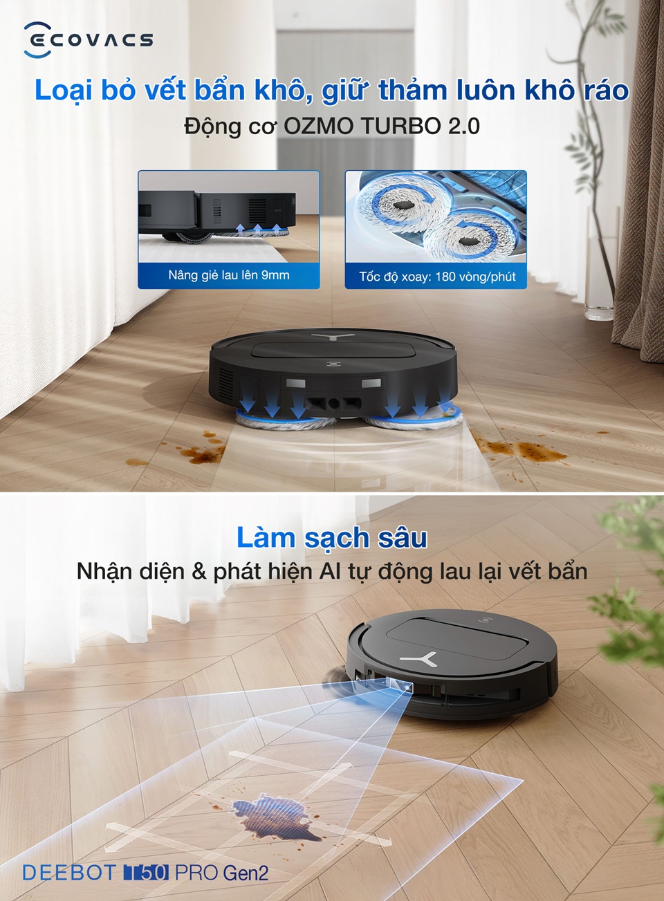 T50 Pro OMNI Gen 2 sử dụng hệ thống lau OZMO Turbo 2.0 với 2 mâm xoay mạnh mẽ. Robot có thể tự giặt giẻ bằng nước nóng 75°C và sấy khô bằng khí nóng ngay tại trạm. Tính năng nâng mâm lau tự động 9mm giúp không làm ướt thảm khi đi qua.