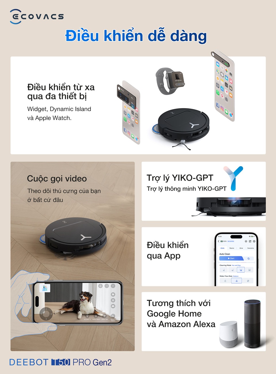 T50 Pro OMNI tích hợp trợ lý YIKO AI có thể hiểu và thực thi lệnh bằng tiếng Việt. Người dùng có thể điều khiển bằng giọng nói hoặc gửi tin nhắn qua app Ecovacs Home. Ngoài ra, robot cũng tương thích với Alexa và Google Assistant.