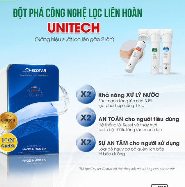 Máy lọc nước Geyser Ecotar 9 ứng dụng công nghệ Nano Unitech 4-in-1 liên hoàn. Giúp tăng hiệu suất lọc gấp đôi so với lõi thông thường. Hệ thống sử dụng 3 lõi lọc Unitech với hơn 10 cơ chế lọc nano tổng hợp. Giúp tối ưu khả năng xử lý tạp chất và giữ khoáng tự nhiên.