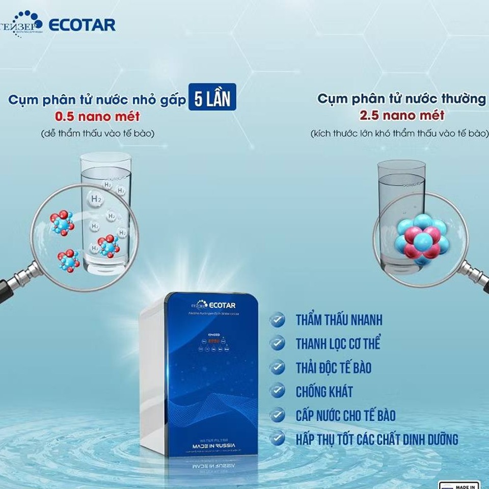 Điểm khác biệt lớn nhất của Ecotar 9 là khả năng tạo nước giàu hydro. Loại nước này thẩm thấu nhanh vào cơ thể. Giúp trung hòa gốc tự do, tăng cường trao đổi chất, hỗ trợ làm đẹp da và phòng ngừa nhiều bệnh mạn tính. Đây là lợi ích mà máy lọc nước thông thường không có.