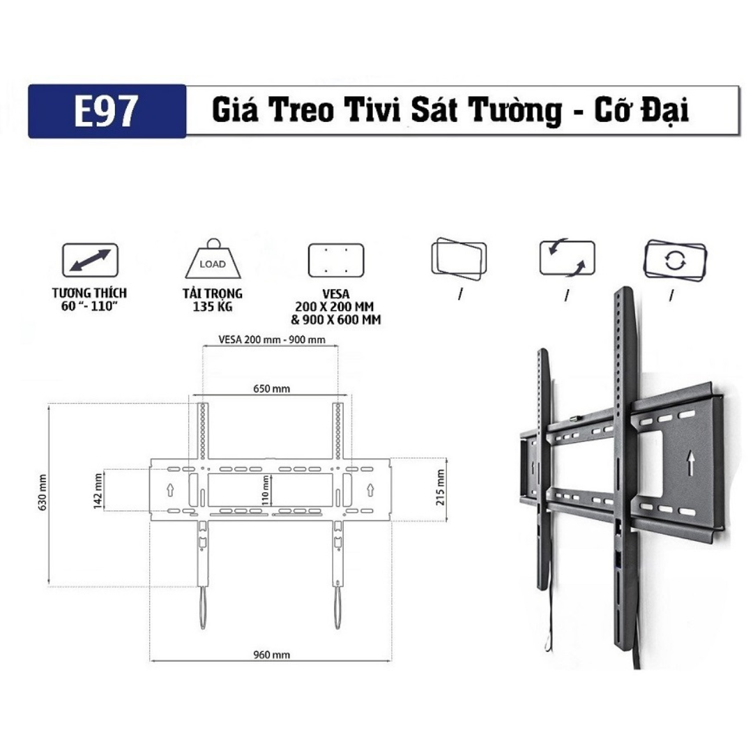 Giá treo hỗ trợ chuẩn VESA 200 × 200 mm đến 900 × 600 mm. Nhờ vậy, E97 tương thích với nhiều mẫu Tivi lớn từ Samsung, LG, Sony, Xiaomi và các dòng màn hình signage.