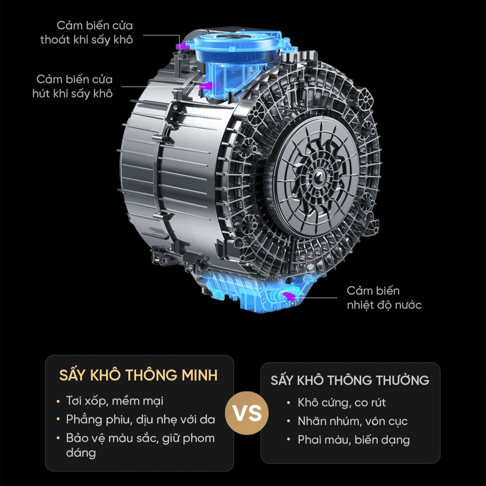 - Sấy khô thông minh kiểm soát nhiệt độ và độ ẩm theo thời gian thực.