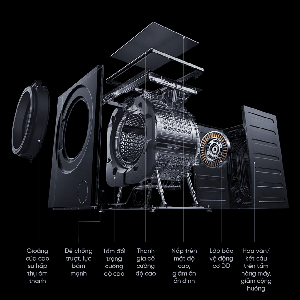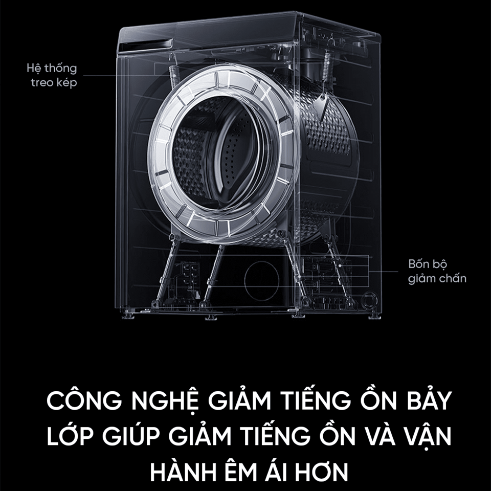 Trang bị hệ thống giảm rung 6 chiều kết hợp cấu trúc cách âm 7 lớp, giúp máy hoạt động êm ái ngay cả khi vắt ở tốc độ cao. Bạn có thể giặt đồ vào ban đêm mà không làm ảnh hưởng đến giấc ngủ hay sinh hoạt.