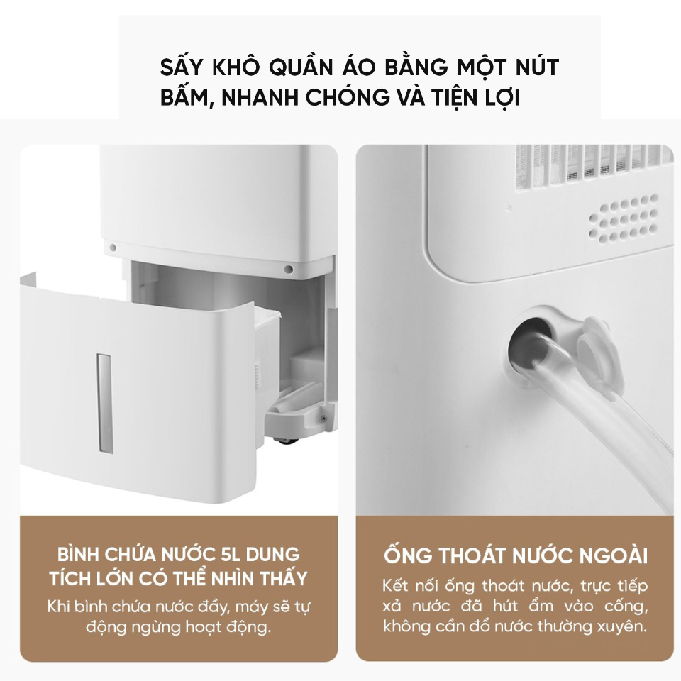 Thiết bị hỗ trợ hai phương pháp thoát nước: sử dụng bình chứa 5 lít hoặc nối ống dẫn thoát nước trực tiếp. Khi dùng ống xả liên tục, máy có thể chạy 24/7 mà không cần giám sát. Đây là ưu điểm quan trọng của máy hút ẩm chống nồm so với dòng mini.