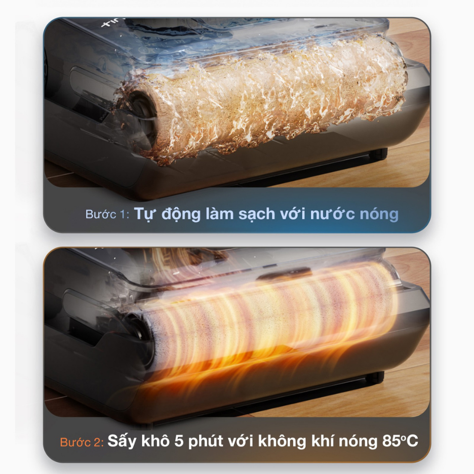 Chào bạn, máy hút bụi lau sàn này có chức năng tự động rửa con lăn và sấy khô bằng khí nóng 85°C rất tiện lợi. Quá trình này diễn ra tự động, bạn không cần phải cài đặt gì thêm, chỉ cần cho máy hoạt động và nó sẽ tự thực hiện các chức năng này. 👍