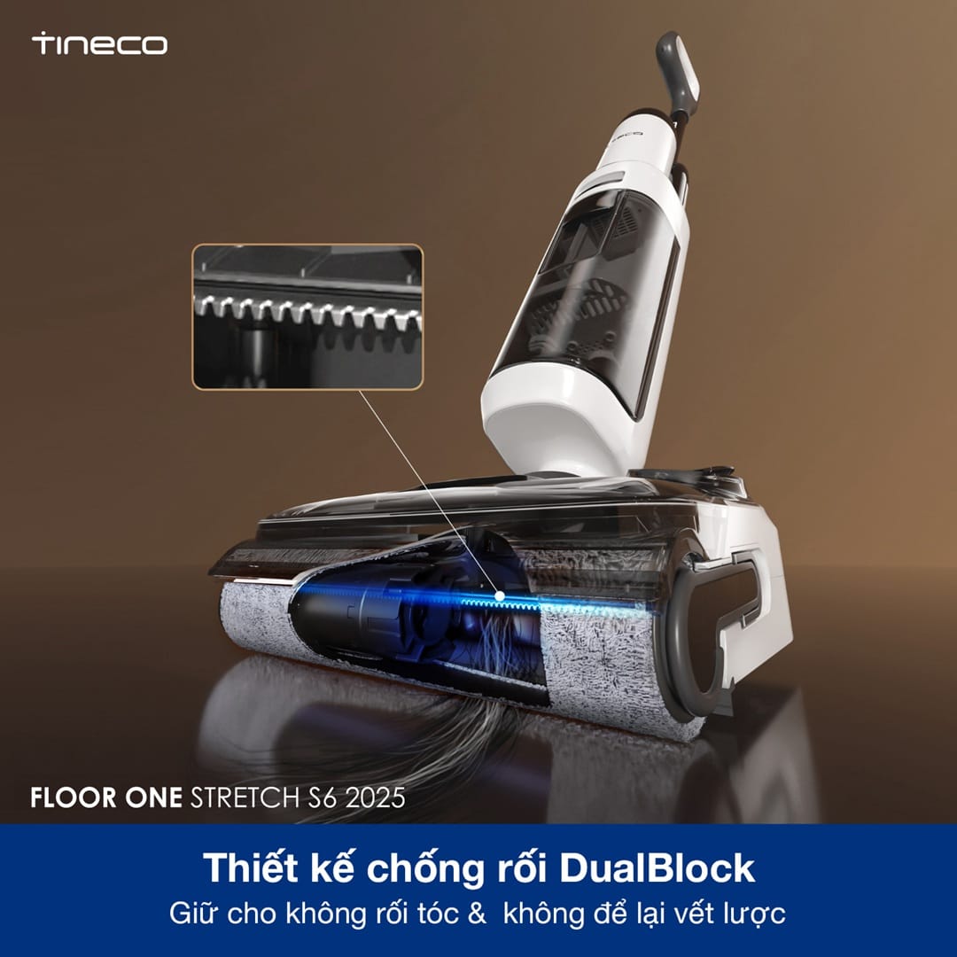 Tineco S6 Stretch được trang bị công nghệ DualBlock Anti-Tangle hiện đại. Hệ thống này giúp ngăn tóc và lông thú cuốn quanh con lăn, giữ máy hoạt động trơn tru.