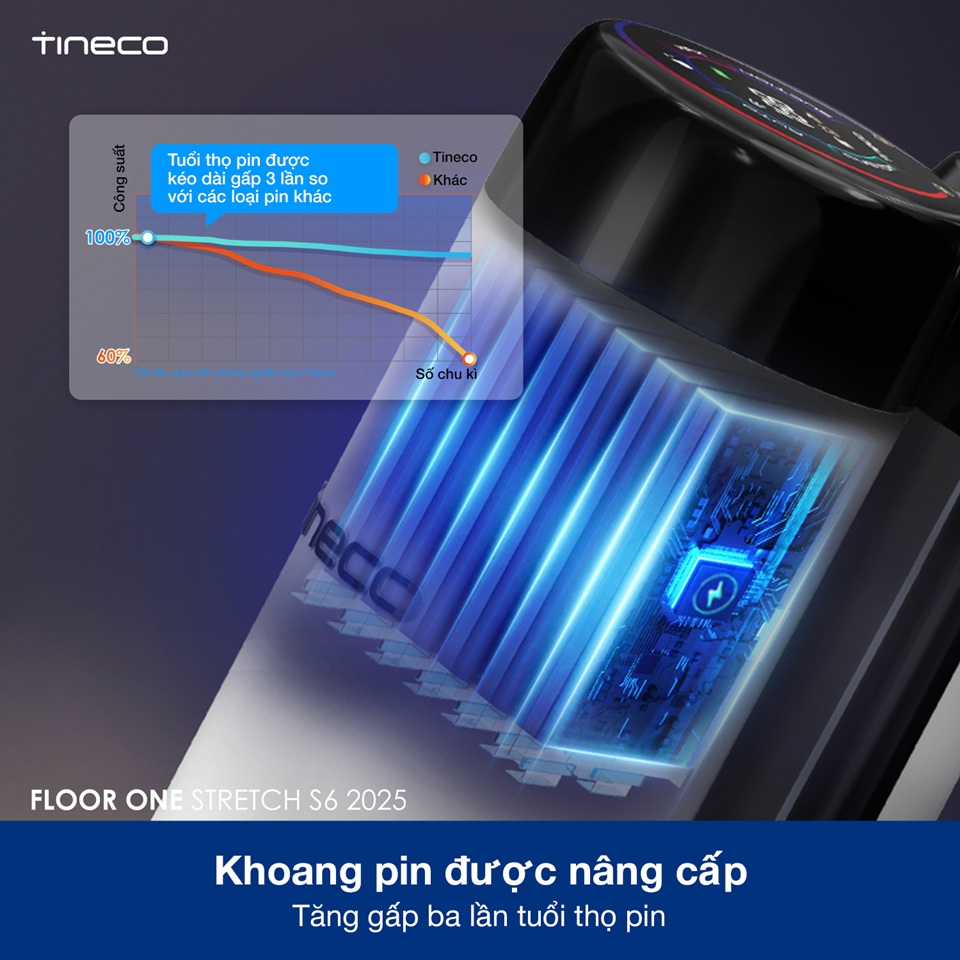 Tineco S6 Stretch sử dụng công nghệ pin nâng cấp với cấu trúc tối ưu, giúp tăng hiệu suất dẫn điện và giảm sinh nhiệt. Nhờ đó, tuổi thọ pin được kéo dài gấp 3 lần so với pin truyền thống.