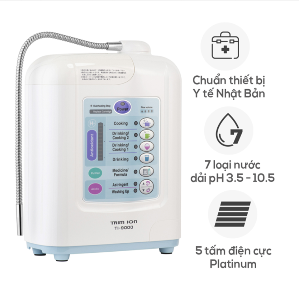Trim Ion TI-9000 là dòng máy lọc nước điện giải cao cấp đến từ Nhật Bản. Sản phẩm được kiểm định nghiêm ngặt và khuyến nghị sử dụng bởi Bộ Y tế Nhật. Với khả năng tạo ra nước ion kiềm giàu hydro, TI-9000 giúp cải thiện sức khỏe tiêu hóa, làm chậm quá trình lão hóa và tăng cường đề kháng cho cơ thể.