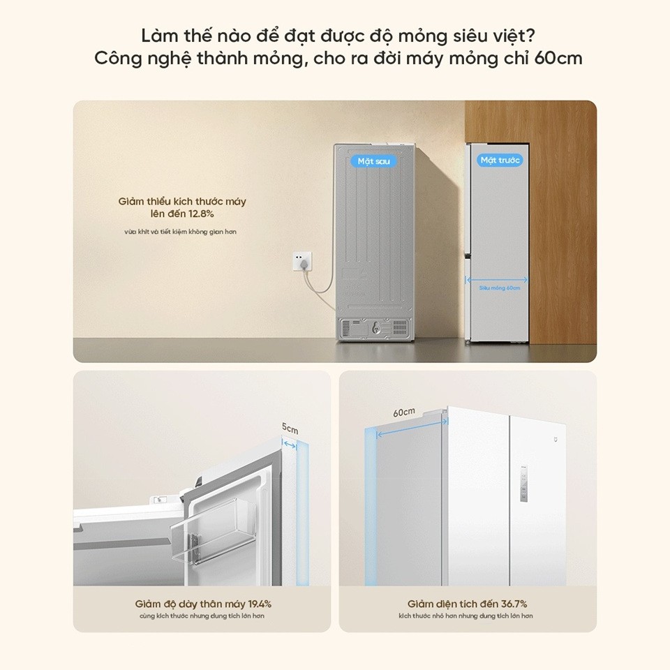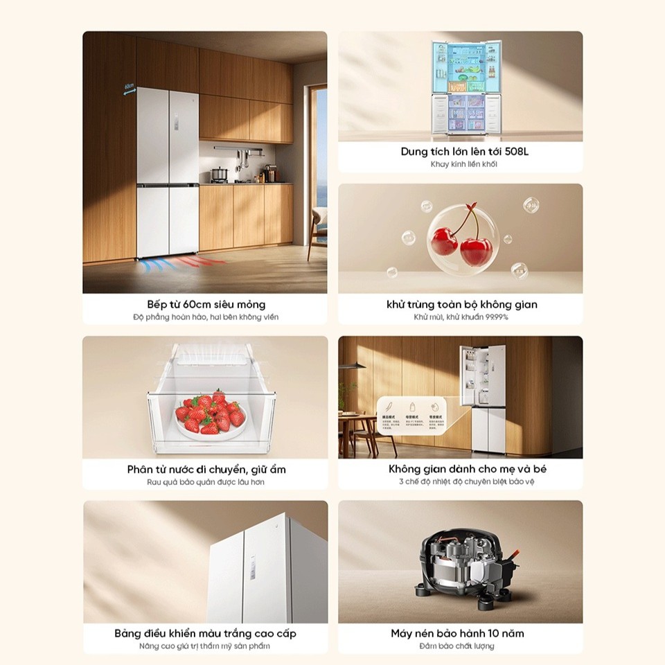 Tủ lạnh Xiaomi Mijia 508L Pro 4 cánh (BCD-508WTGBI) là lựa chọn lý tưởng cho gia đình hiện đại. Thiết kế siêu mỏng 60 cm giúp tiết kiệm diện tích bếp và dễ lắp đặt âm tường. Bề mặt kính pha lê trắng Ice Crystal White sang trọng, tinh tế và dễ vệ sinh. Dung tích lớn 508 lít với ngăn mát, ngăn đông và ngăn linh hoạt được bố trí khoa học. Hệ thống làm lạnh kép ngăn mùi chéo, kết hợp làm lạnh 360° giữ thực phẩm tươi lâu hơn. Công nghệ ion bạc khử khuẩn, khả năng cấp đông sâu –30°C giúp bảo toàn hương vị. Máy nén inverter tiết kiệm điện và vận hành êm ái, phù hợp gia đình yêu thích không gian yên tĩnh. Sản phẩm hỗ trợ kết nối Mi Home, điều khiển từ xa và quản lý dễ dàng qua điện thoại.