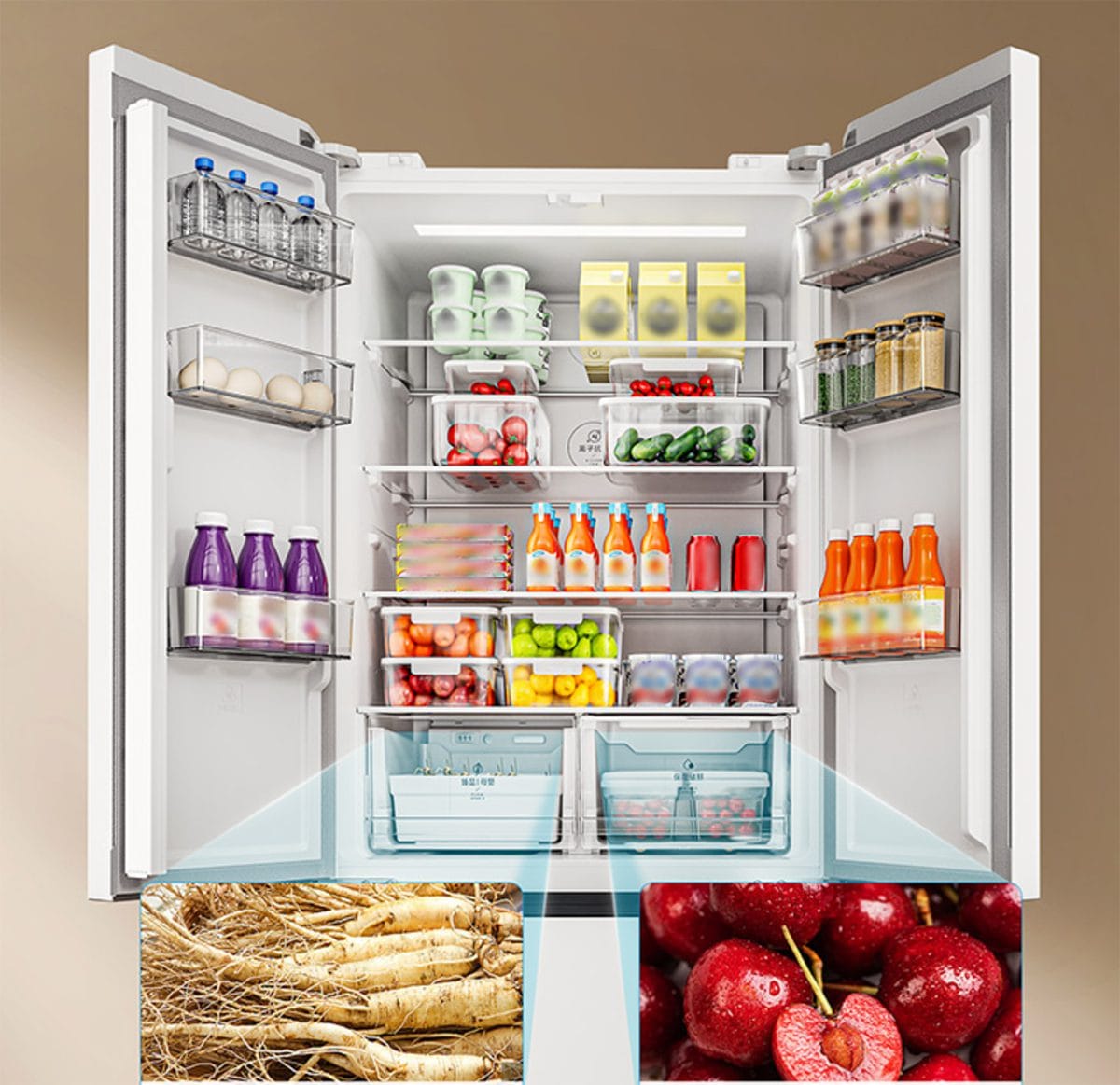 Các ngăn được chia rõ ràng, giúp bạn sắp xếp thực phẩm gọn gàng và thuận tiện khi lấy ra. Kệ tủ làm từ kính cường lực chịu lực cao, có thể tùy chỉnh độ cao để chứa nồi, hộp lớn. Ngăn cửa được thiết kế sâu, đựng được chai nước 2L, lon nước ngọt, hộp sữa lớn. Thiết kế 4 cánh mở độc lập giúp giảm thoát khí lạnh không cần thiết, góp phần tiết kiệm điện và giữ thực phẩm tươi lâu hơn.